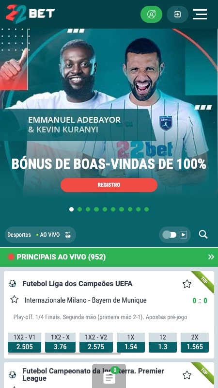 A casa de apostas 22Bet promove uma série de ofertas associadas a apostas desportivas, como as seguintes: