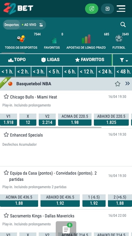A 22Bet disponibiliza apostas desportivas em mais de 50 modalidades diferentes, com uma ampla variedade de opções, incluindo mais de 1000 eventos diários. Além das apostas tradicionais, a plataforma também oferece apostas em eSports e desportos virtuais. No seu portfólio, a 22Bet inclui ainda apostas especiais, abrangendo categorias como meteorologia, política, programas de TV, entre outras.
