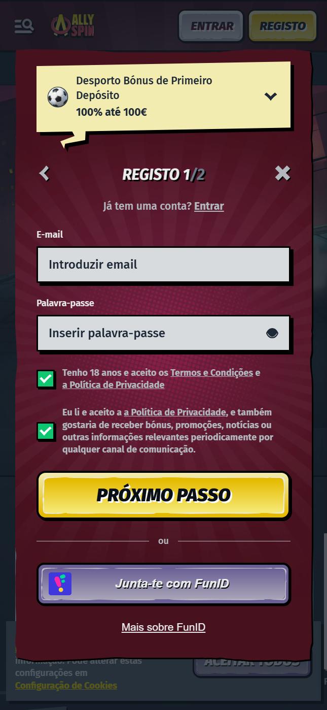 Só há uma hipótese de apostar na AllySpin Bookmaker e é estar registado. Para isso acontecer o apostador terá que seguir alguns passos e cumprir algumas etapas de registo. Tudo será rápido e simples, como veremos a seguir:
