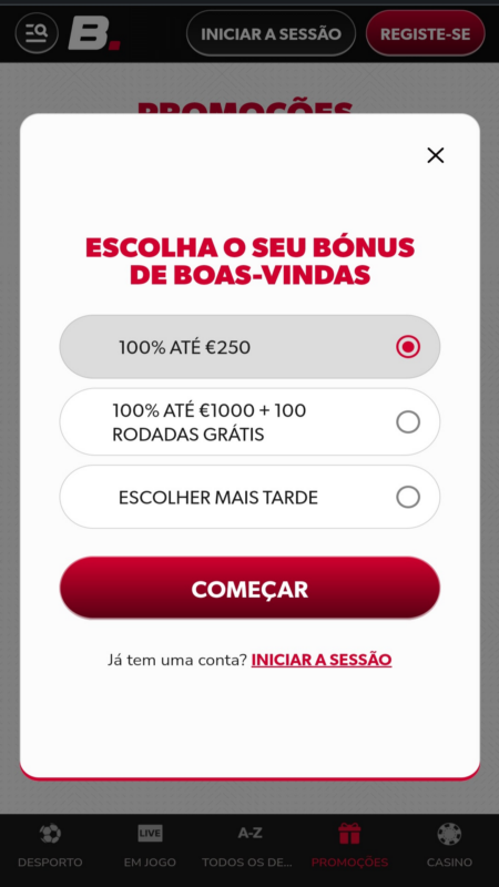 | 👏 Bónus de Boas-Vindas de Desporto | 100% até 250 € |