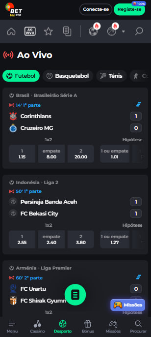 Ao selecionar um evento ao vivo, o cliente irá visualizar, num pequeno ecrã do lado direito, uma representação gráfica do recinto de jogo, com indicações da movimentação da bola e informações sobre os passes e jogadas.