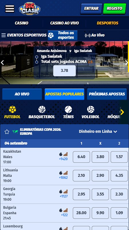 A BigClash Bookmaker completa esse gosto pelo desporto com uma oferta vasta e muito completa com modalidades populares no nosso país. Tens disponível todas as ferramentas que precisas para apostares informado, seja em jogos ao vivo, ou em antes dos jogos.