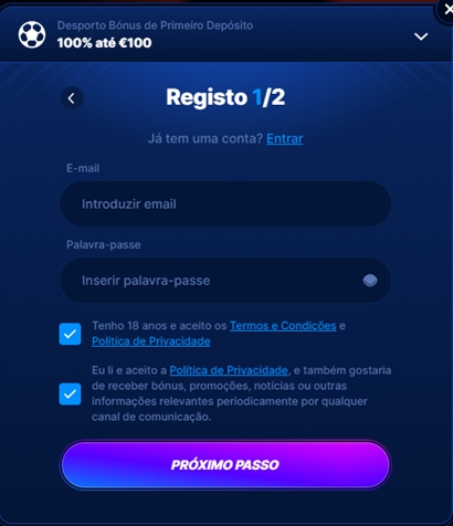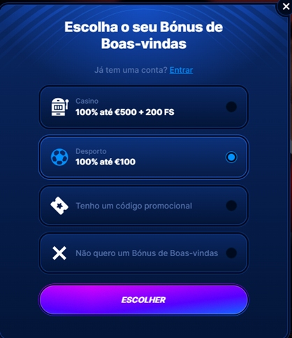 Ao registar uma conta os jogadores podem receber o bónus de boas-vindas para desporto, que duplica o valor do primeiro depósito até 100€ sempre que ele respeita um valor mínimo de 20€.