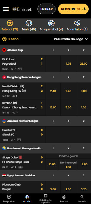As apostas ao vivo na EmirBet são completas e divertidas. Encontre cotações dentro da média e mercados que possibilitam ganhos consideráveis. Você pode apostar antes do início da partida ou durante o evento, em tempo real. Os desportos disponíveis são: