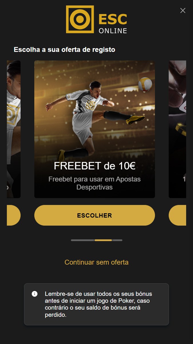 Se é novo no ESC Online não deixe passar a oportunidade de ganhar até 250€ em Freebets com o seu primeiro depósito. Para isso, apenas terá de realizar um depósito de pelo menos 250€ e apostar 500€ no total em odds iguais ou superiores a 2.00. Assim, serão desbloqueadas as 25 Freebets de 10€ que podem ser utilizadas em odds iguais ou superiores a 1.70.