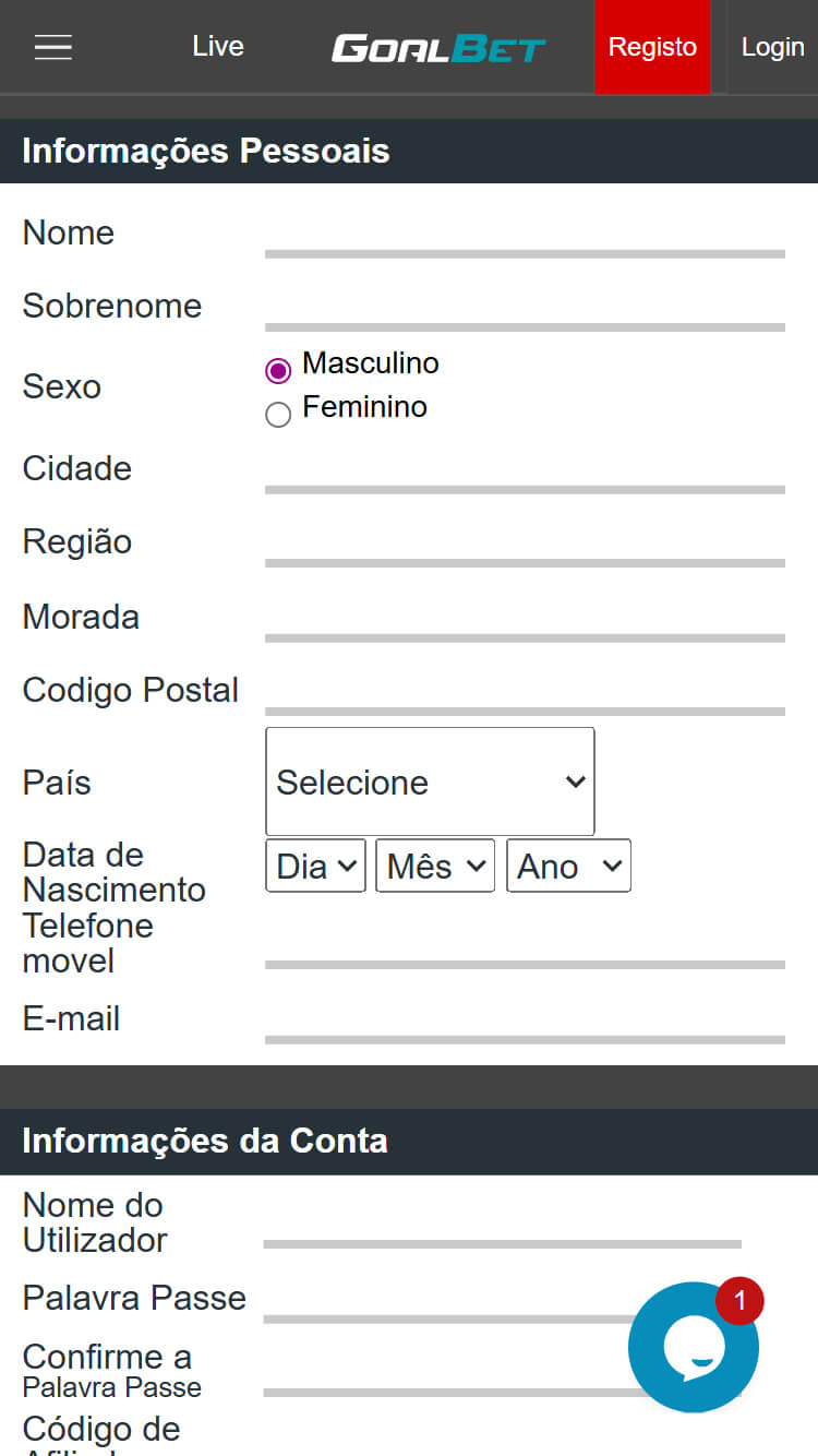 O processo de registo na Goalbet Portugal é muito fácil. Ao entrar no site, na parte superior direita, encontra um botão de Registo com fundo a vermelho.