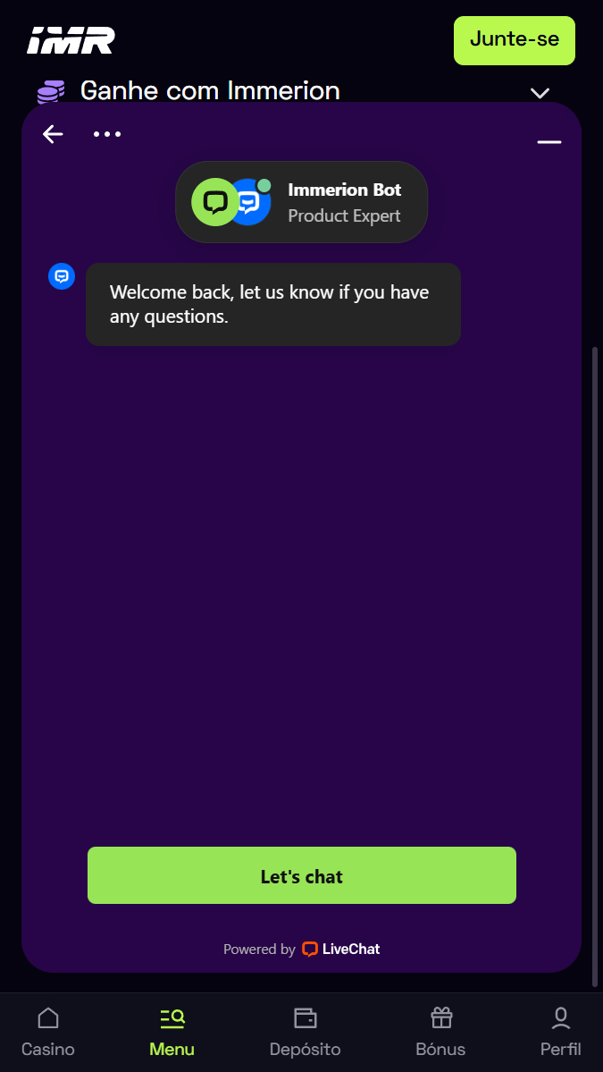 O apoio ao cliente do Immerion Casino Bookmaker está ligado a jogo responsável de uma forma direta. Qualquer apostador que necessita de ajuda pela dependência do jogo, pode e deve contactar o apoio ao cliente.