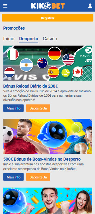 Há apenas um bónus de boas-vindas para quem deseja apostar em desportos na Kikobet. No primeiro depósito, ganhe 100% até EUR200. Já no segundo, receba 50% até EUR300 para utilizar em toda a área desportiva da plataforma. Para transformar em dinheiro real, todas as apostas feitas com bónus precisarão ser em cotações 1.80 ou superior. Cada jogador terá 30 dias para concluir o rollover antes da expiração do bónus.