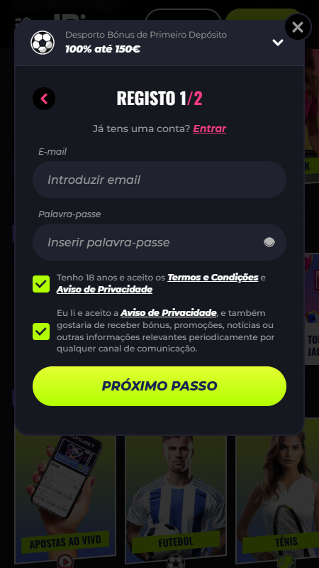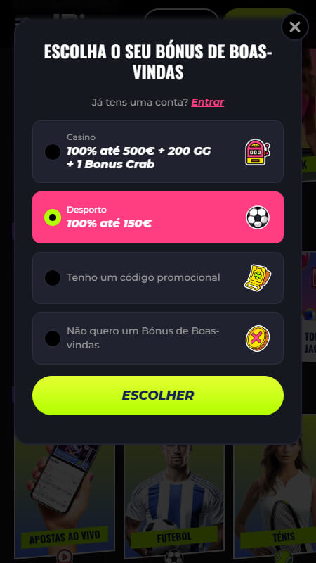 | 💰 Bónus de 1.º Depósito (Desporto) | 120% até 250 € |