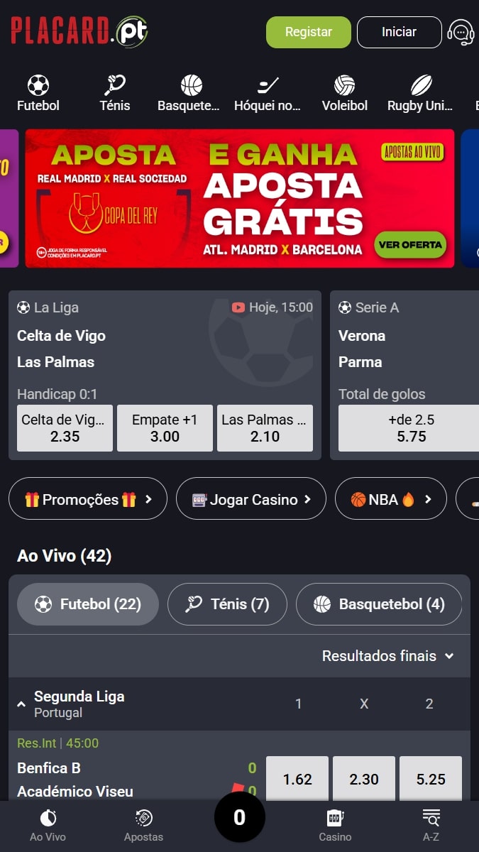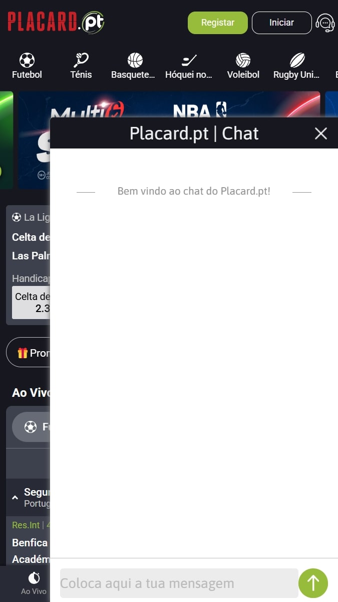 A área de apostas ao vivo, assinalada no topo da página de apostas, conduz a uma seção dedicada, com o conjunto de eventos e partidas a acontecer em tempo real.