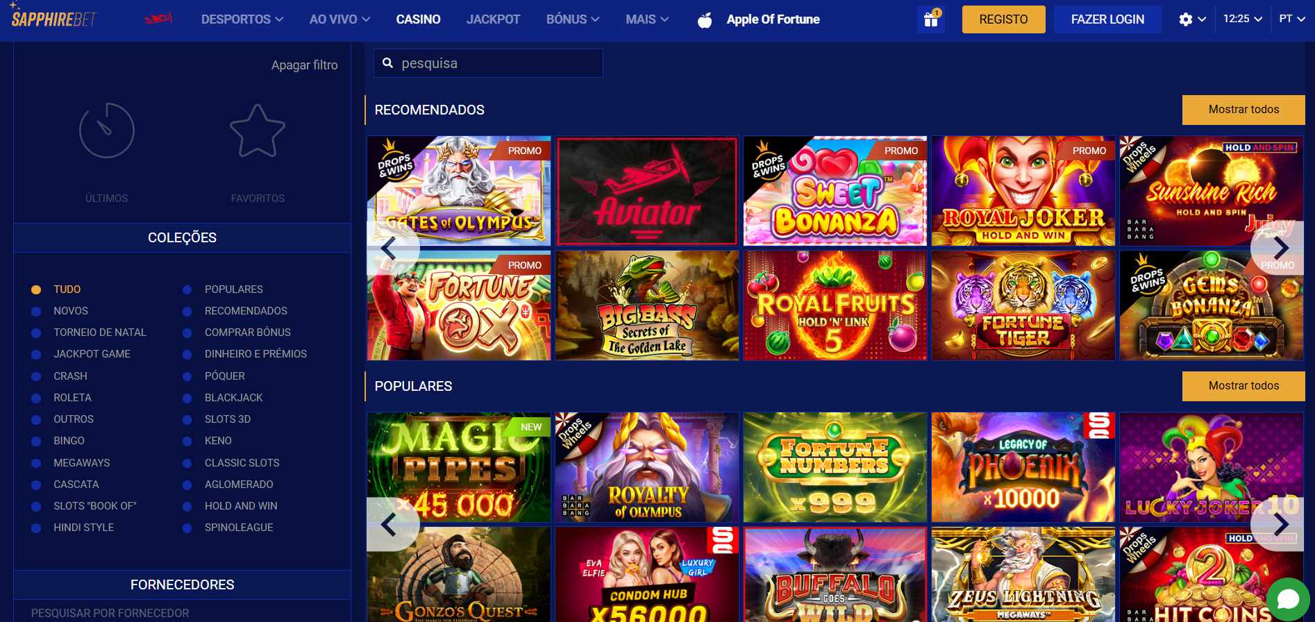 A área de casino do Sapphirebet inclui casino online, casino ao vivo, jogos rápidos, jogos de TV e bingo. Estas são as principais seções do casino, onde o cliente poderá encontrar a coleção de slots machines, os jogos de mesa, os “fast games”, e os jogos com dealer ao vivo.