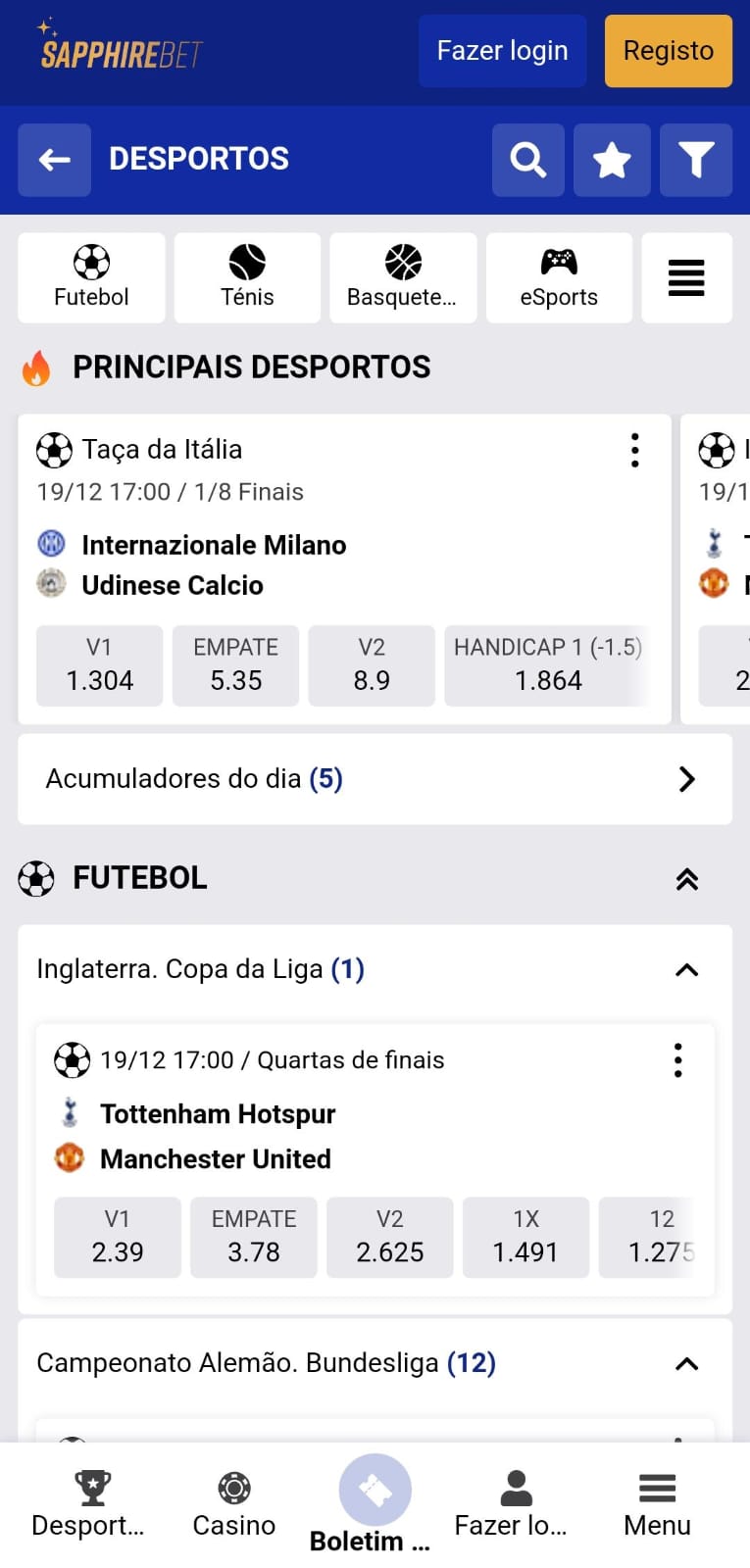 As plataformas desktop e mobile da Sapphirebet, assim como as apps Android e iOS, destacam-se por serem intuitivas e bem organizadas, apresentando um design sofisticado e atraente. Com uma combinação de cores sóbrias, onde prevalece o azul escuro, o site adota uma aparência moderna e acolhedora, projetada para tornar a navegação mais fluida e lógica. Menus, listas, motores de busca e filtros são estrategicamente implementados para facilitar a exploração das diversas áreas e seções de apostas. O site apresenta uma usabilidade optimal, focada na experiência do utilizador.