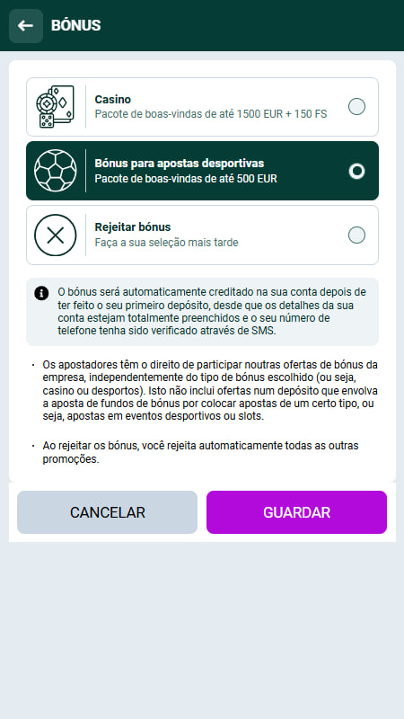 | 👏 Bónus de Boas-Vindas em Desporto | 100% até 500 € |