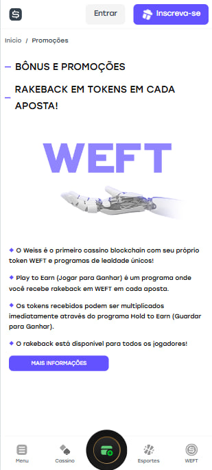 Para além da oferta de boas-vindas a casa de apostas Weiss.bet ainda faz a entrega de um bónus especial, o Rakeback em Tokens por cada apostas. Com esta oferta os jogadores recebem rakeback em WEFT (token da Weiss) sempre que coloca uma aposta. O valor recebido pode ser multiplicado de imediato, com recurso ao programa “Hold to Earn”.