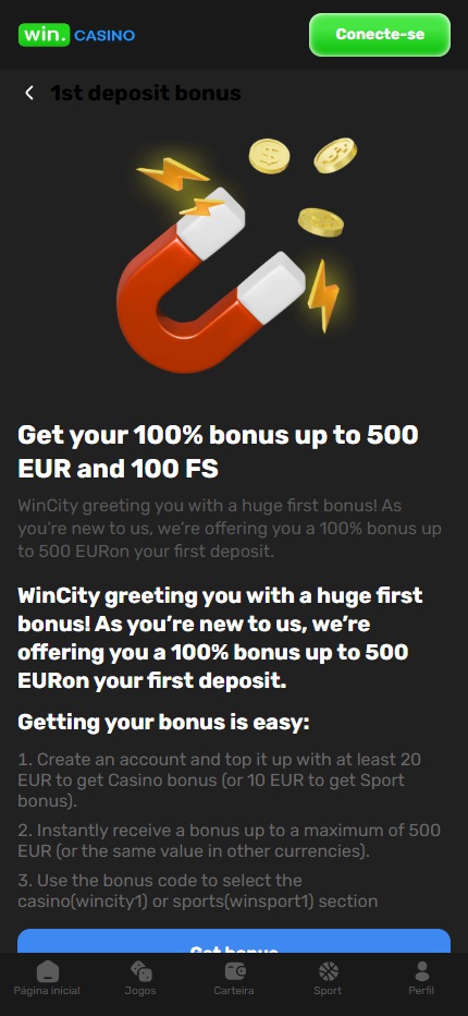 O depósito mínimo é de 10€, sendo que o jogador deve colocar o código promocional “winsport1” no campo respectivo aquando o depósito. O requisito de aposta é de 45x.