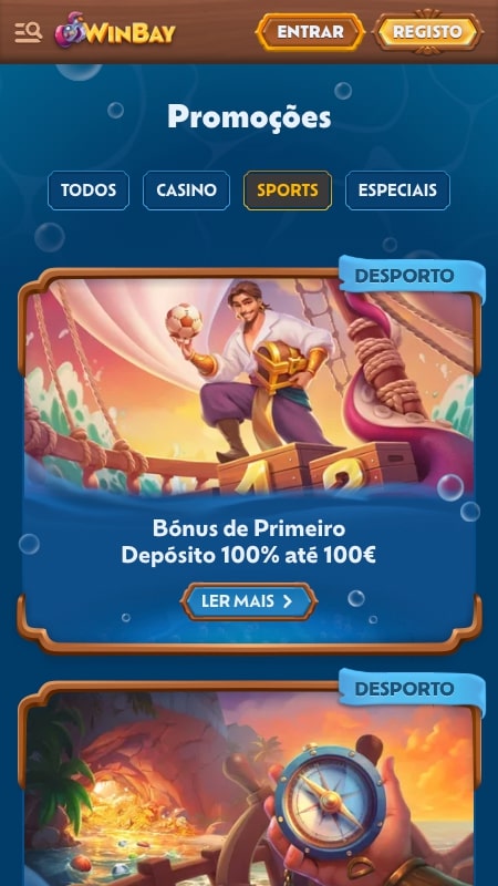 Os novos apostadores que concluem o registo no Winbay Bookmaker beneficiam de um bónus até 100 € em desporto ou 500 € no casino! Ao realizar o primeiro depósito, a casa de apostas paga-te o dobro do valor depositado. Esta é uma excelente maneira de receber os novos apostadores na Winbay.