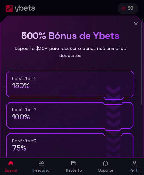 O bónus de boas-vindas da Ybets é de 500% sobre os 4 primeiros depósitos, repartidos da seguintes forma:
