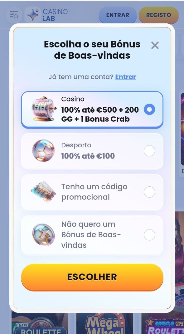 O bónus de boas-vindas do CasinoLab consiste num bónus de 100% até 500 euros, complementado por 200 rodadas grátis e 1 bonus crab. O depósito mínimo de 10€ qualifica o jogador a receber o saldo de bónus e o bónus crab, sendo que a atribuição das 200 FS carece de depósito mínimo de 20€. O requisito de aposta é de 35x, o valor do depósito e do bónus, para o saldo de bónus, e de 40x, para as rodadas grátis, com um prazo de validade de 10 dias. Quanto ao bonus crab, este poderá ser trocado na loja do Casinolab por diferentes recompensas, como saldo de bônus, dinheiro real ou rodadas grátis adicionais.