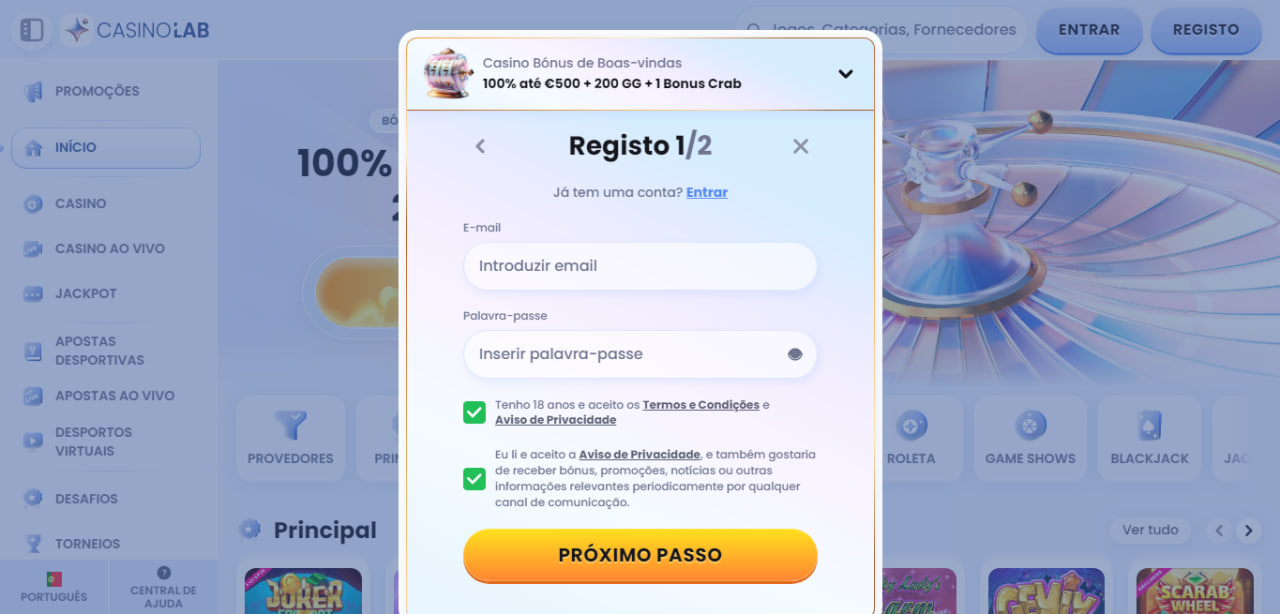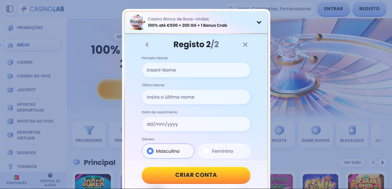 O CasinoLab apresenta um registo completo, com envio de link por email para validação da nova conta. O jogador deve, depois disso, verificar a conta, confirmando a sua identidade e titularidade, através do envio de documentos solicitados.