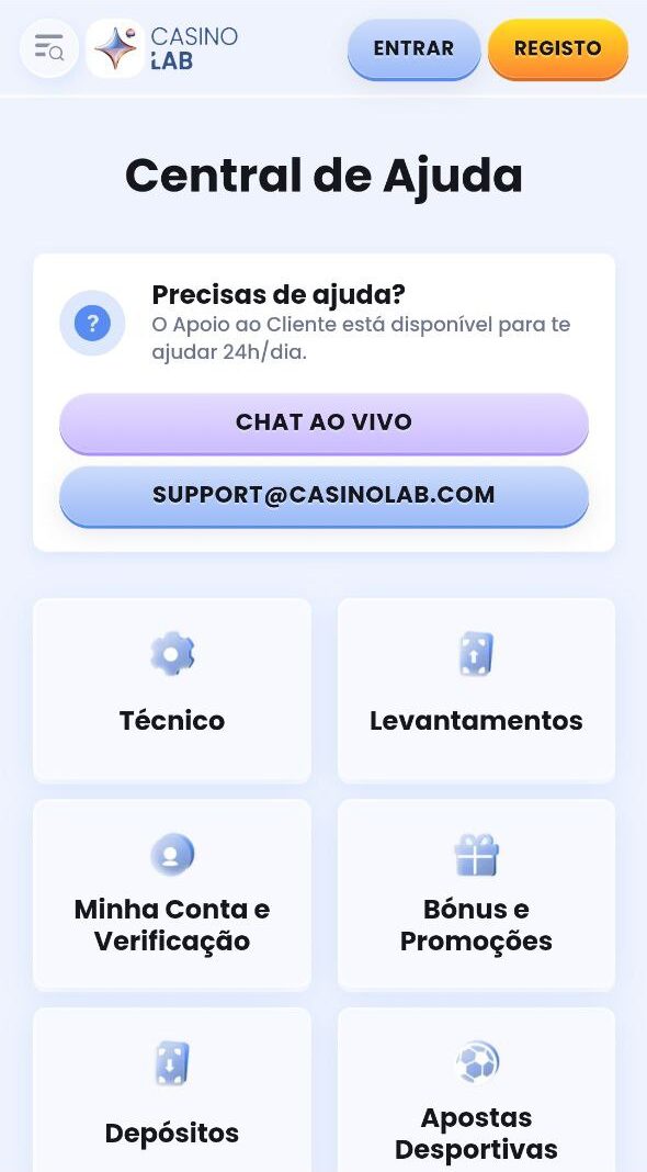 O CasinoLab presta apoio ao cliente em português. No site, um link “Central de Ajuda”, orienta o cliente com tópicos de ajuda e respostas às questões mais habituais. O jogador pode entrar em contacto com o serviço de atendimento ao cliente através de chat ou e-mail, como se informa abaixo: