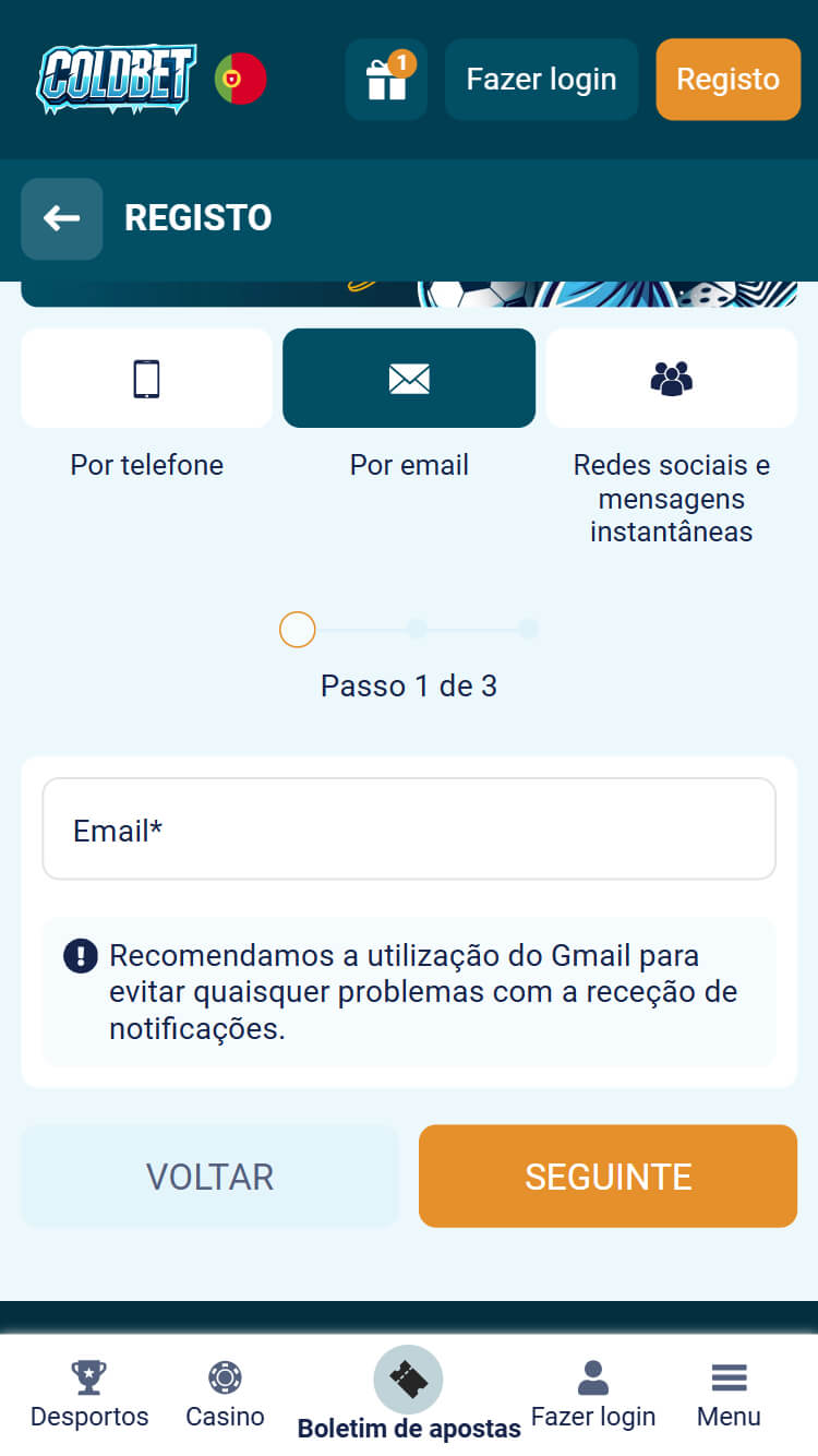 Para conseguires entender tudo, vamos criar o seguinte guia passo-a-passo, que te vai guiar de forma perfeita no ato do registo. Assim é como te podes registar no Coldbet Casino:
