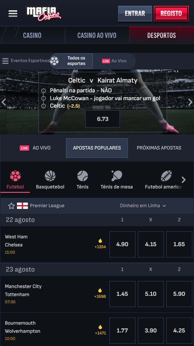O MafiaCasino mais do que um casino onde podes jogar slots ou casino ao vivo, é uma plataforma completa de entretenimento online onde podes também realizar apostas desportivas! Aqui apostas em desportos conhecidos como o futebol e ainda nos menos populares como o ténis de mesa.