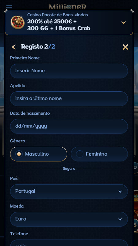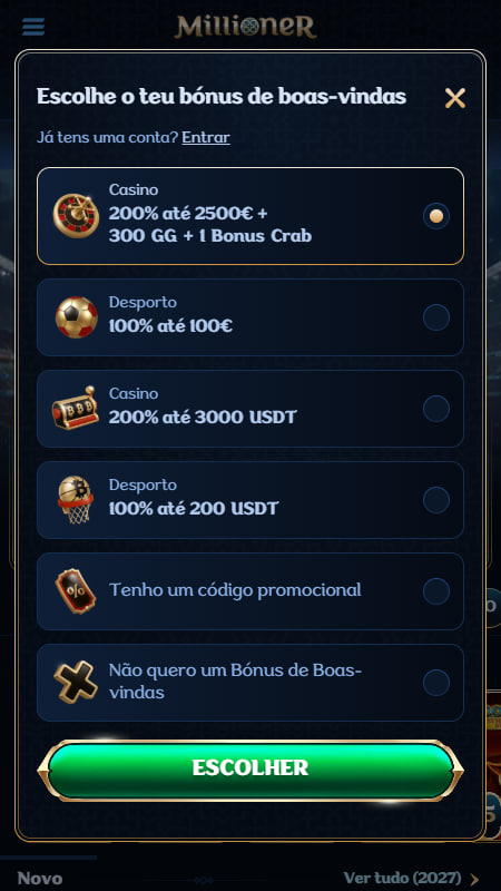 O Millioner está tão bem conseguido, que até o registo é um processo simples e acessível a todos. Podes escolher logo o teu bónus de boas-vindas ou optares por não o receber nesta fase.