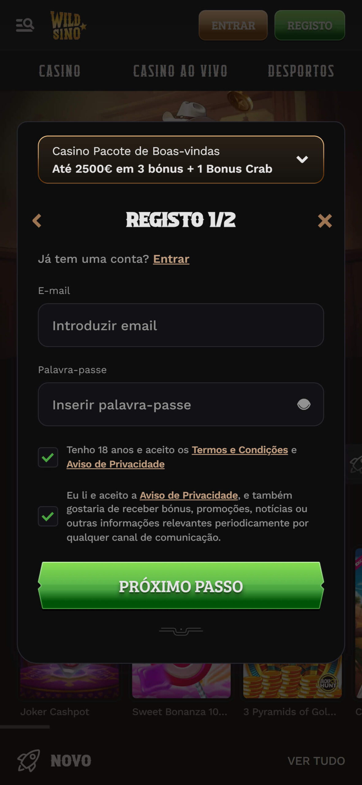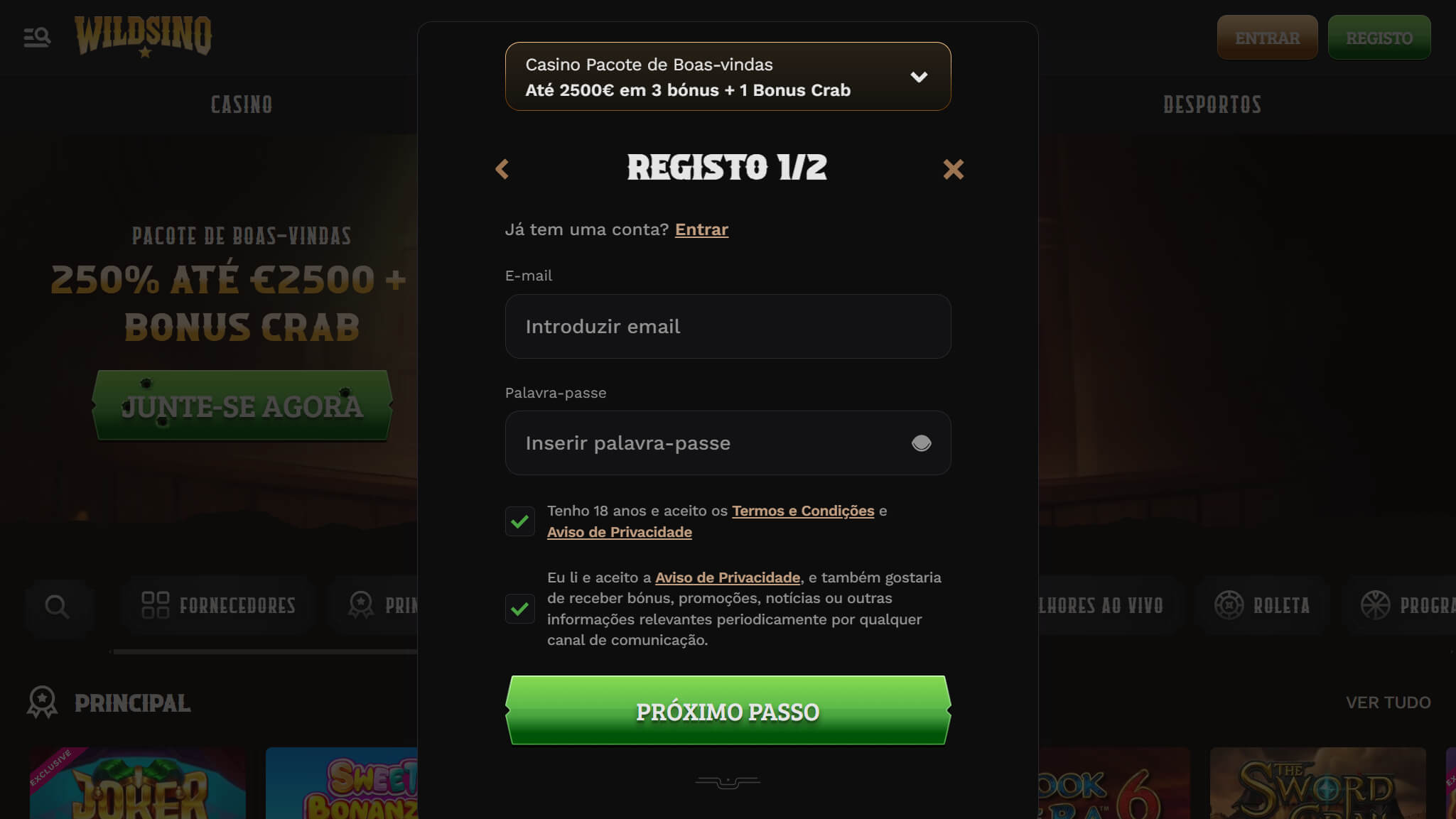 Para realizar o registo no Wildsino precisará do email, dados como a morada e o seu nome. Para se registar no Wildsino faça o seguinte: