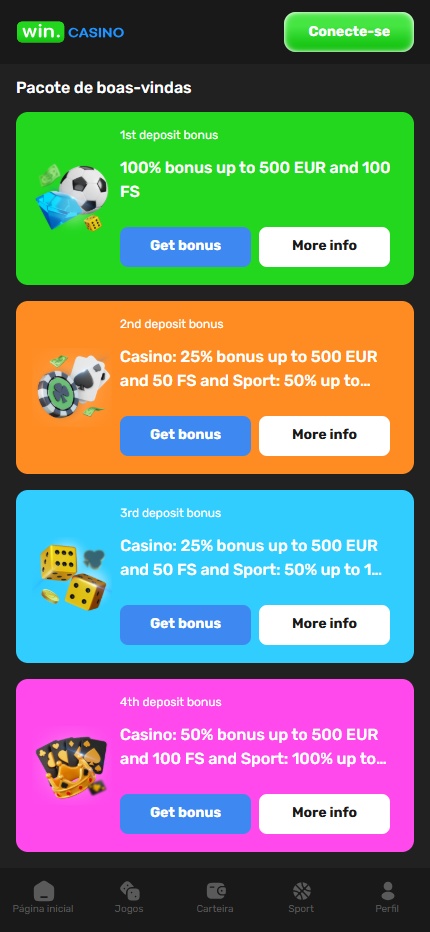 O Win.casino atribui, aos novos jogadores, um bónus de boas-vindas sobre os quatro primeiros depósitos: