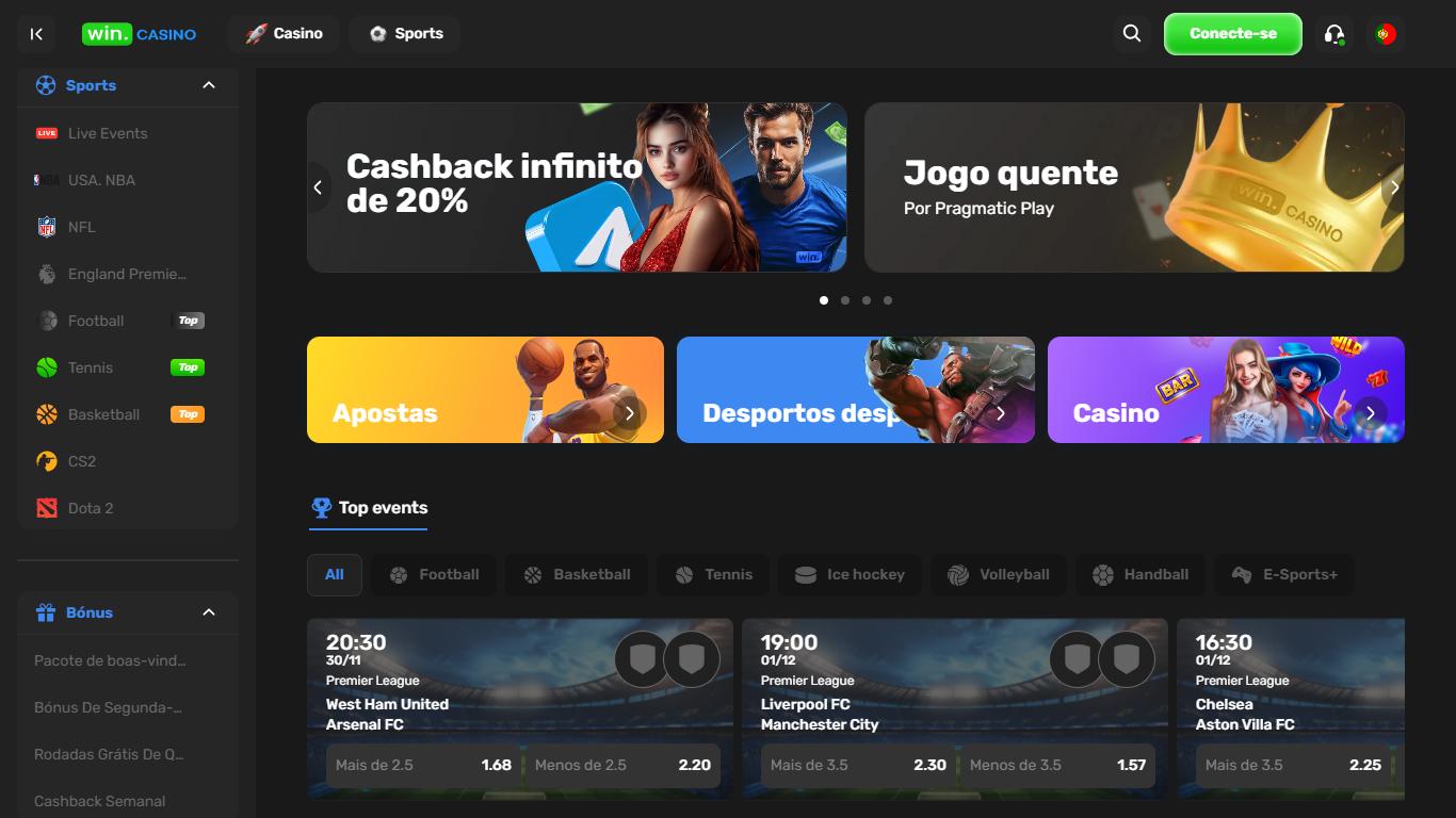 O Win.casino apresenta a sua área de apostas, numa seção com o nome de “Win.bet”, onde exibe as diferentes apostas disponíveis, como apostas desportivas num vasto leque de modalidades, e apostas eSports, com os principais torneios dos jogos eletrónicos mais populares. O site apresenta apostas pré-evento e apostas ao vivo, em vários mercados, com odds alinhadas com a indústria.